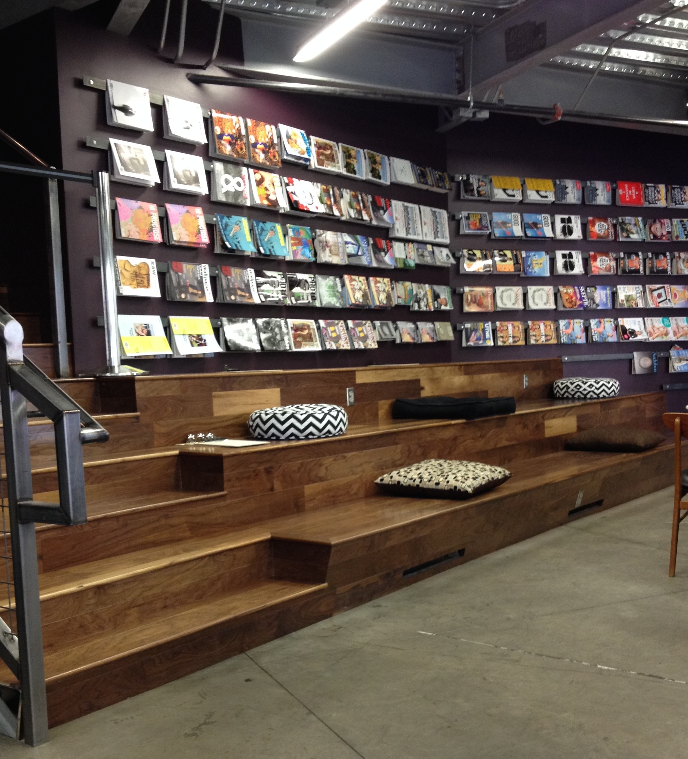 There are lots of choices for seating including a wooden, theatre style, tiered area with pillows to use. I sat at a table in the corner that had a bench seat on the wall and a chair across the table. There were also couches in the center that were occupied on and off by people having discussions – probably of business related to downtown…