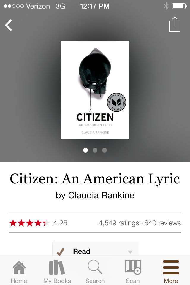 If I could only recommend one book of all the books I’ve read this year, this would be it. Everyone should read this book. Just read it. Claudia Rankine chronicles the treatment of people of color in the world and in the media. If you are interested at all in race relations, you need to read this book. Listen.